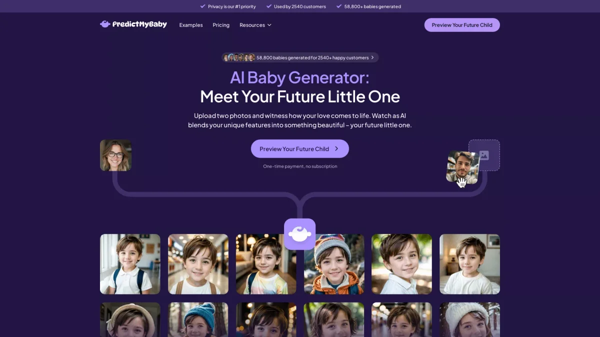 Create hyper-realistic images of your future child by blending parental features using advanced AI technology in just minutes.