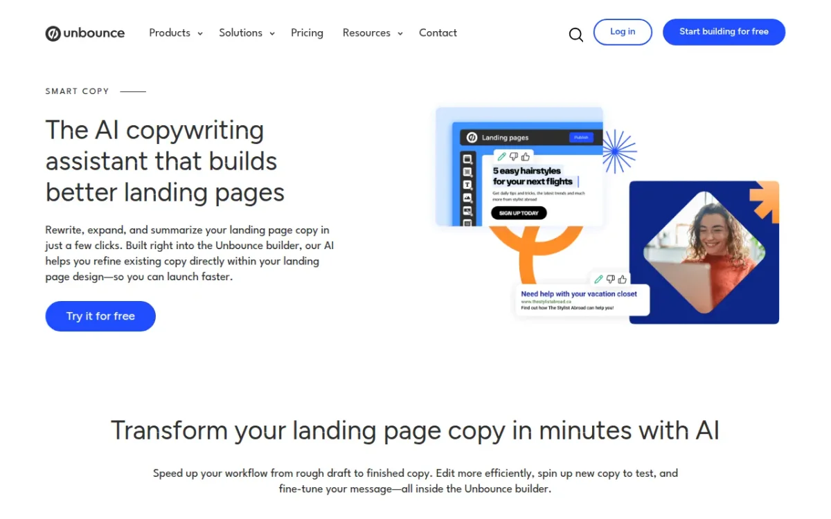 Unbounce Smart Copy streamlines landing page copy creation, enabling users to rewrite, expand, or summarize content quickly and effectively within the Unbounce platform.