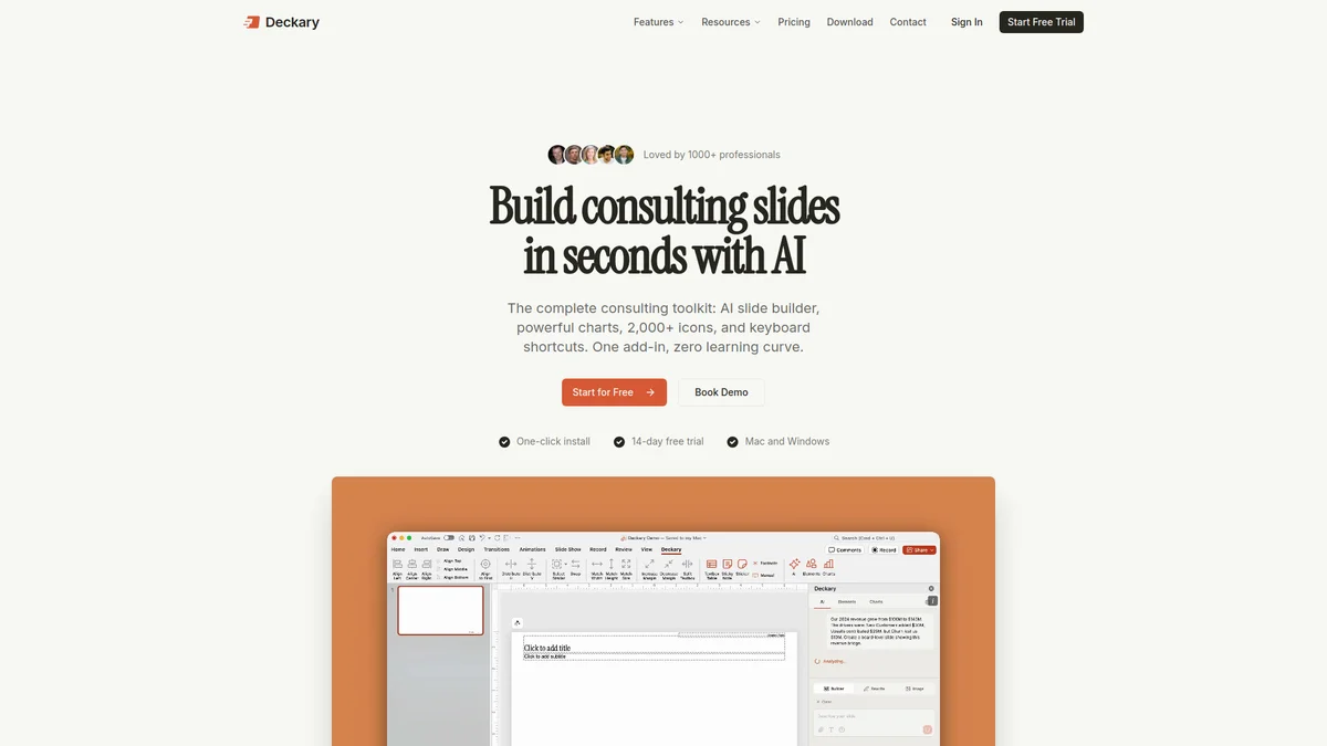 Deckary empowers professionals to create polished consulting presentations quickly using AI, featuring an intuitive slide builder and advanced charting capabilities.