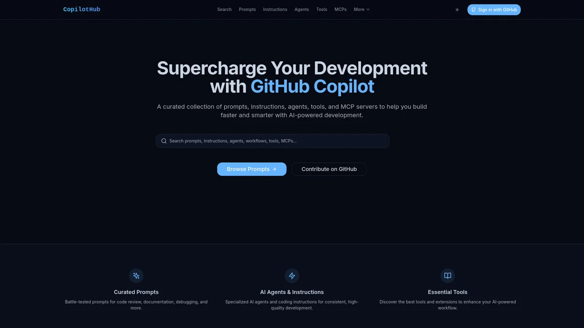 CopilotHub offers curated prompts and tools to enhance coding workflows, upgrade codebases, and streamline development using GitHub Copilot.
