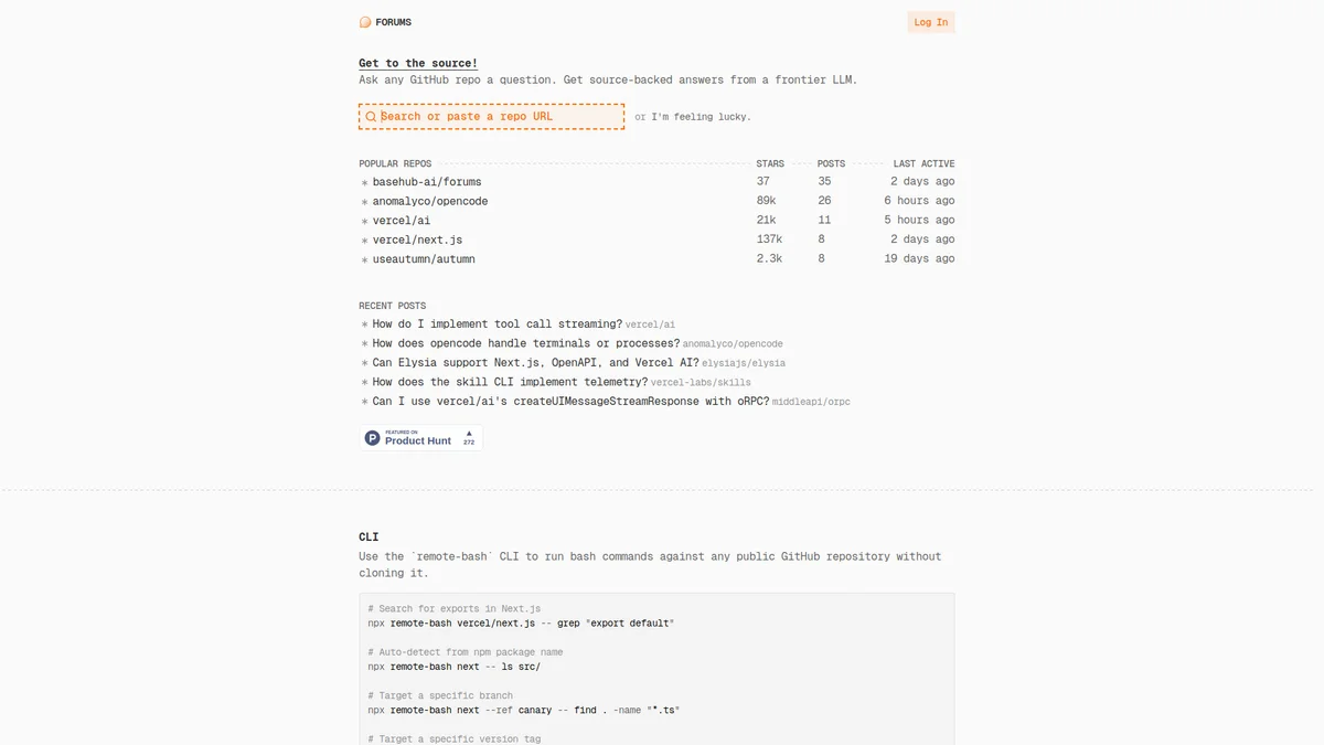 Forums offers a unique platform to ask questions about GitHub repositories, providing source-backed answers powered by advanced LLM technology.