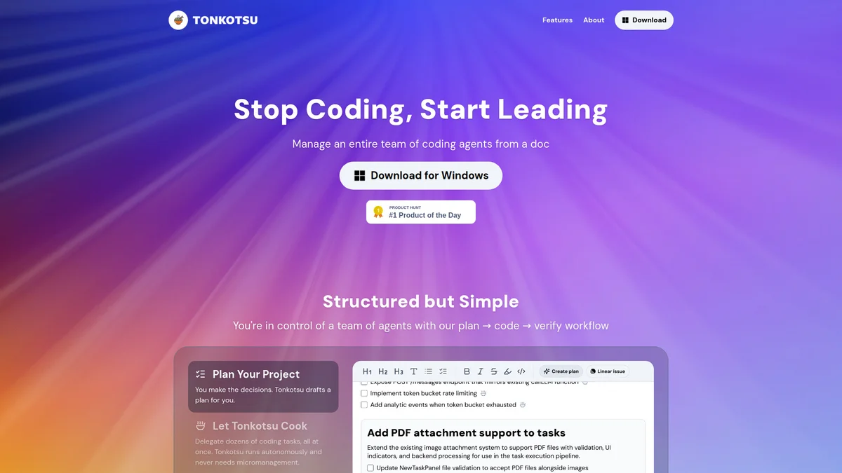 Tonkotsu enhances coding productivity by allowing users to plan, delegate, and verify coding tasks seamlessly within a shared document, reducing time and micromanagement.
