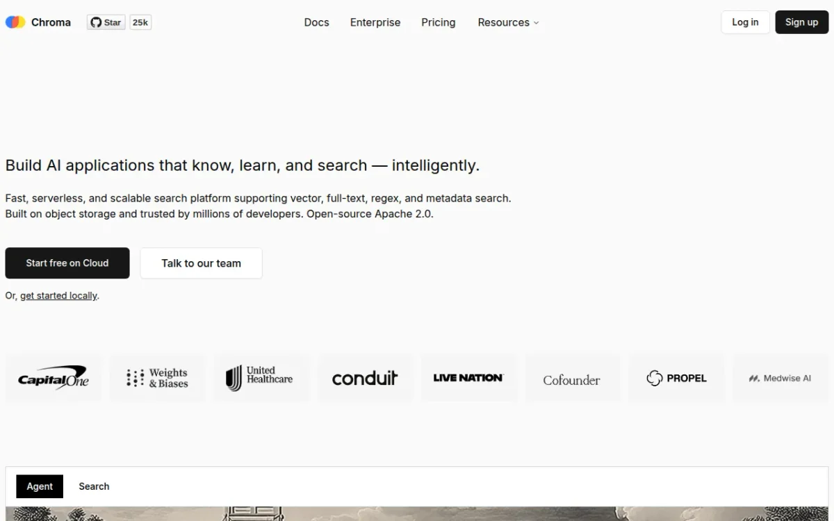 Chroma is a fast, serverless search platform that provides intelligent capabilities for vector, full-text, regex, and metadata search, designed for developers and enterprises.