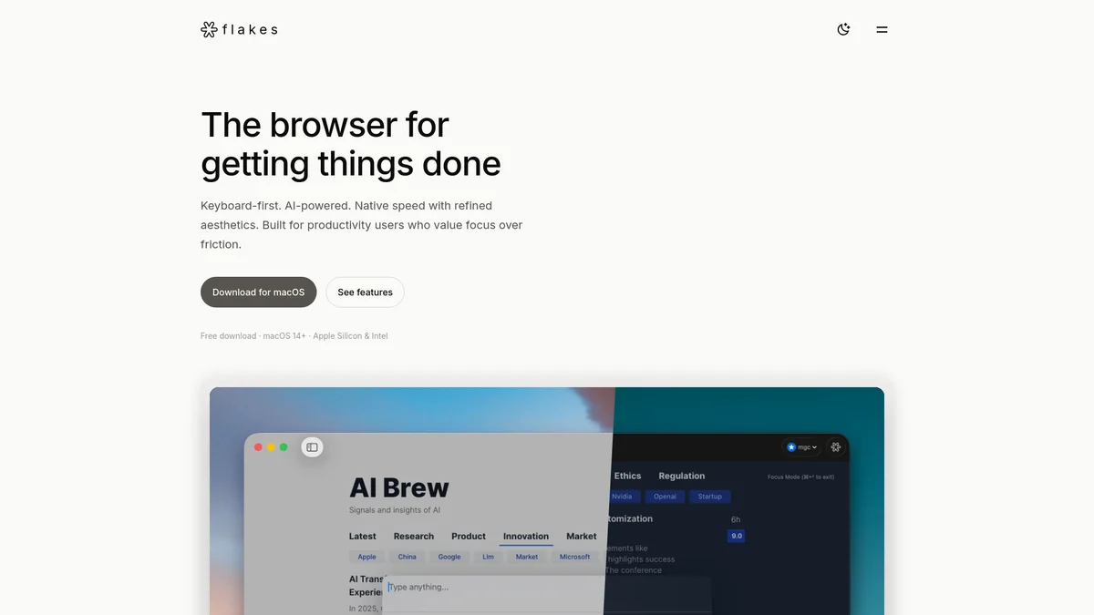 Flakes is an AI-native, keyboard-first browser designed to enhance productivity by minimizing distractions and maximizing focus for macOS users.