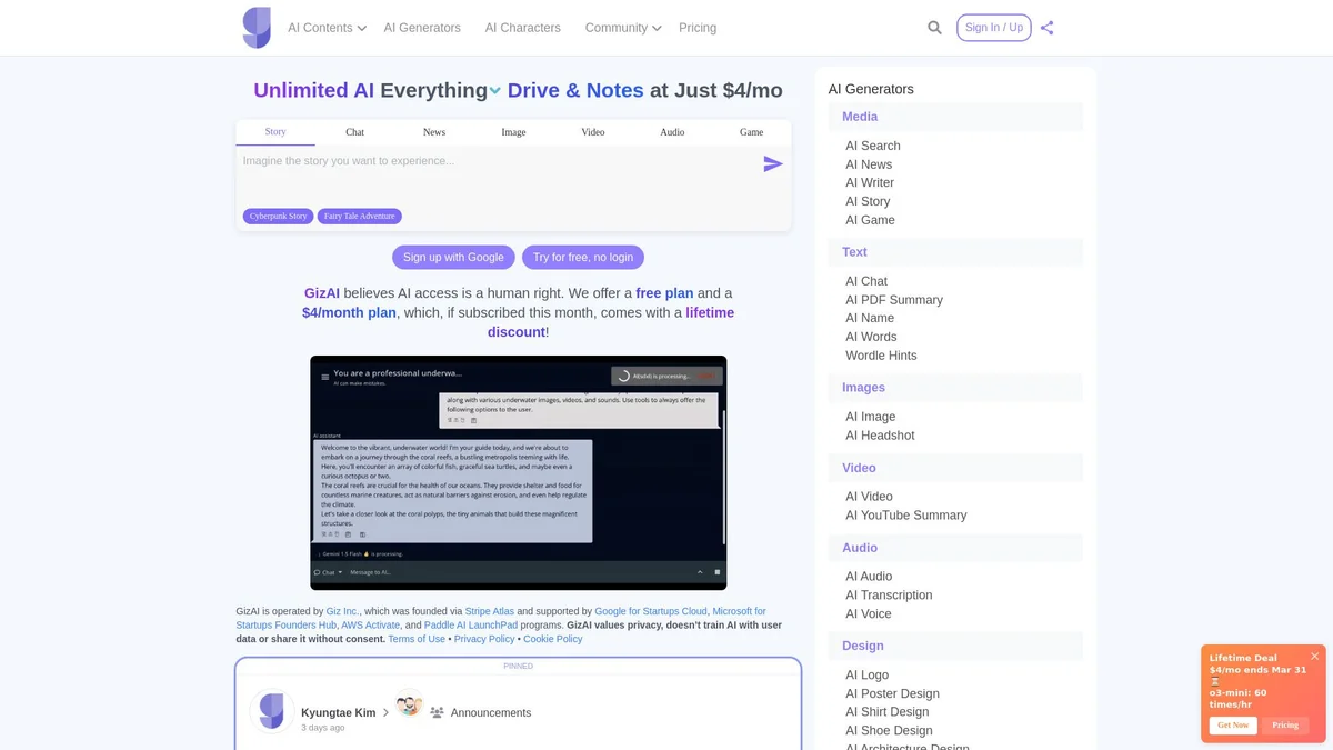 GizAI unifies various AI tools for writing, image generation, video creation, and more, enhancing creativity and productivity across diverse tasks.