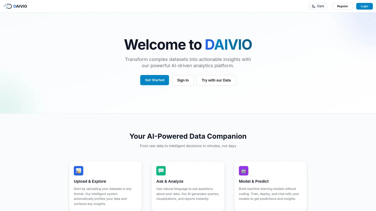 Transform complex datasets into actionable insights with Daivio's advanced AI analytics, enabling quick analysis and visualization of your data.