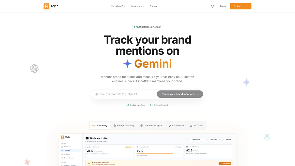 Atyla is a leading GEO platform that enhances your visibility on AI search engines, providing real-time tracking and tailored optimization strategies.