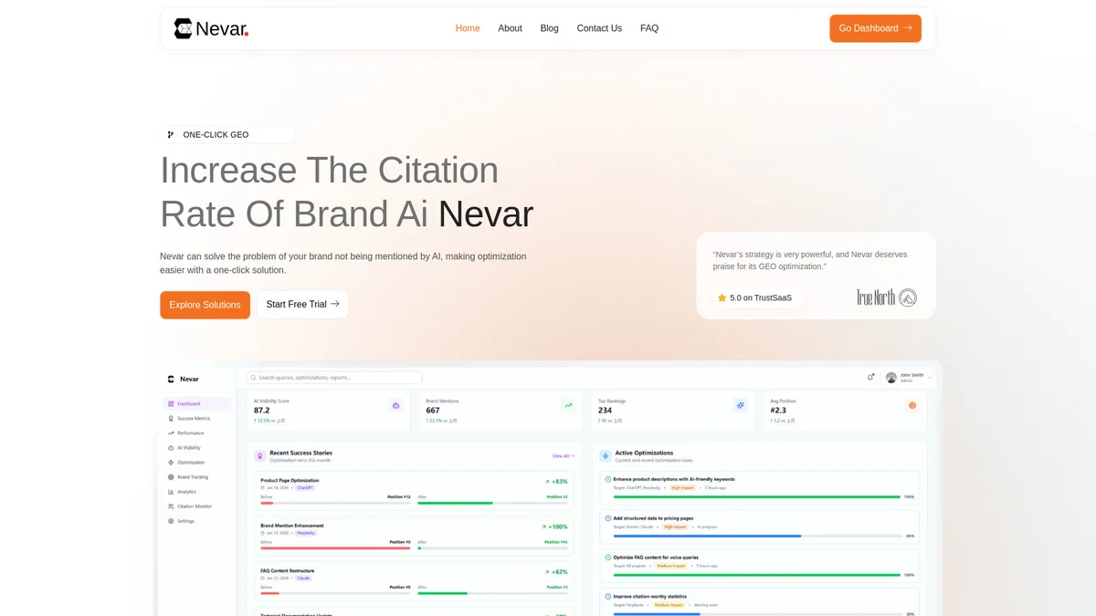 Nevar enhances your brand's presence through AI-driven search visibility and GEO optimization, making optimization simpler and more effective with a one-click solution.