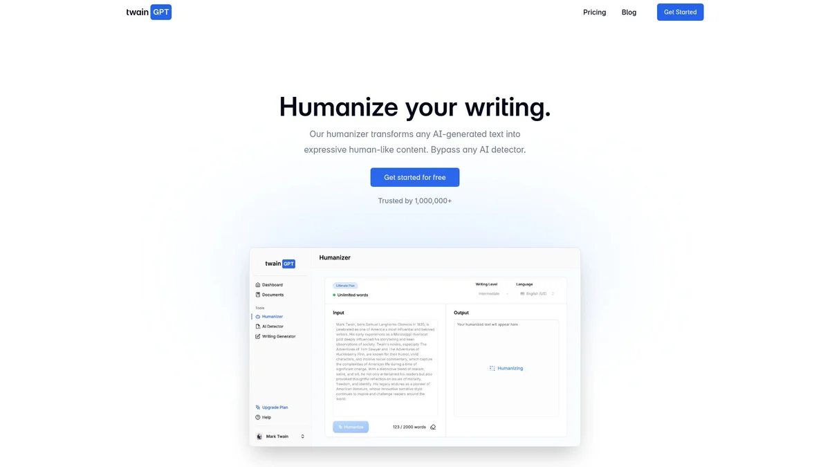 TwainGPT is an AI humanizer that converts AI-generated text into indistinguishable, natural-sounding content, ensuring originality and quality for all users.