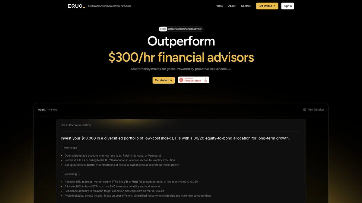EQUO is an AI-driven personal finance assistant that provides explainable investment strategies and financial planning tailored for young professionals and tech enthusiasts.