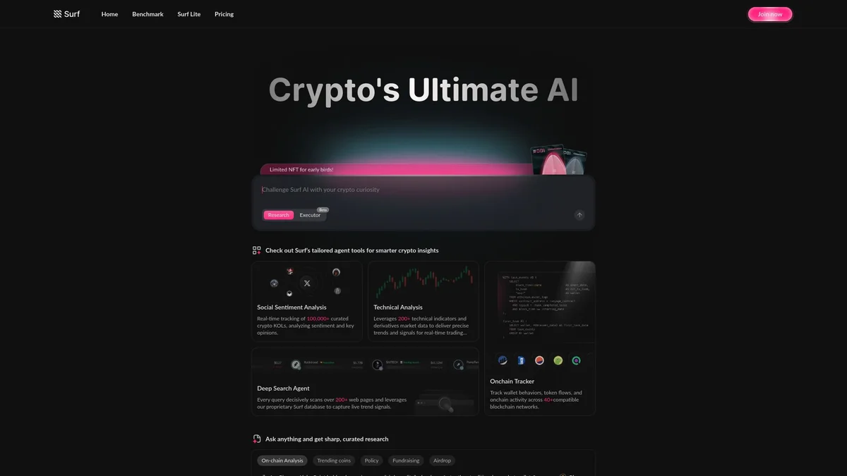 Surf offers advanced AI tools tailored for the cryptocurrency market, providing users with insights and analytics to navigate the dynamic landscape of digital assets.