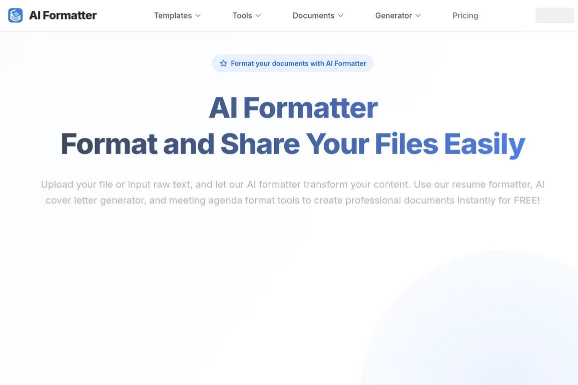 AI Formatter transforms your raw text and files into professional documents using advanced templates for resumes, cover letters, and meeting agendas.