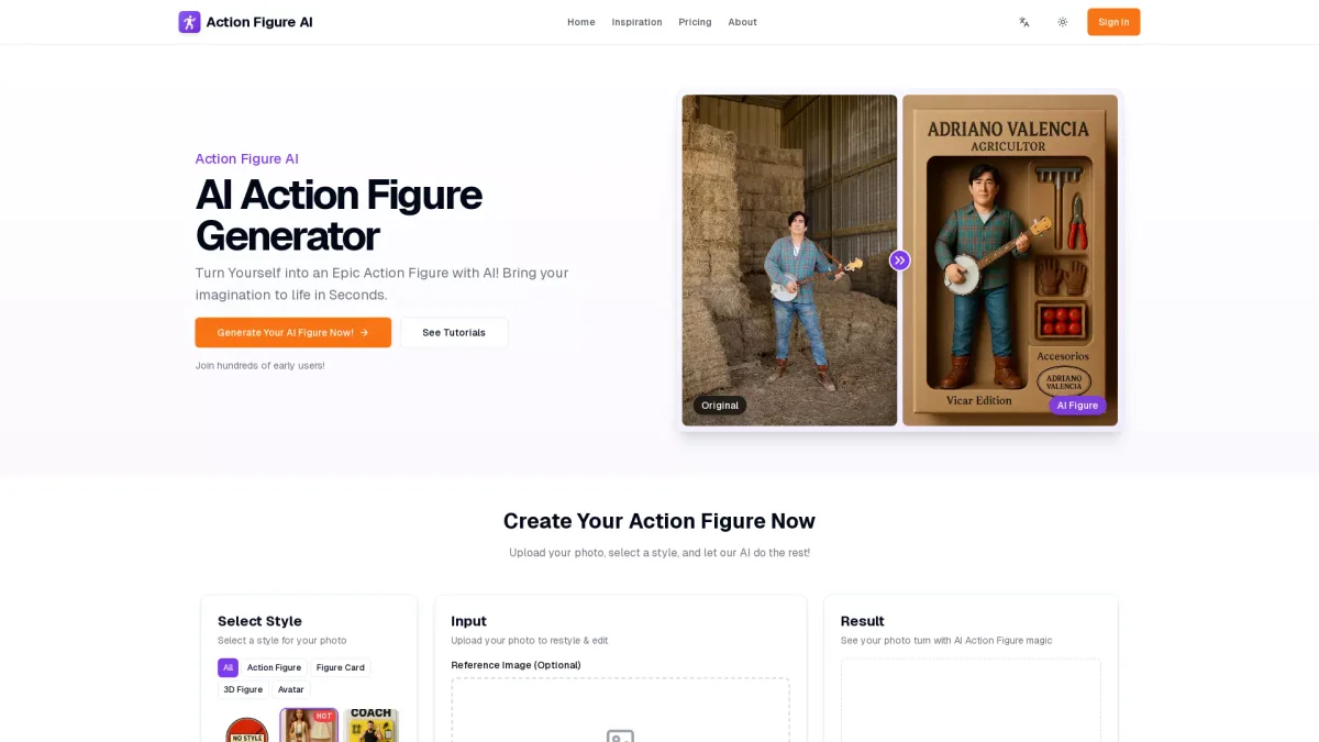 Create unique action figures from your images using AI. Choose styles and customize to express your creativity in seconds.