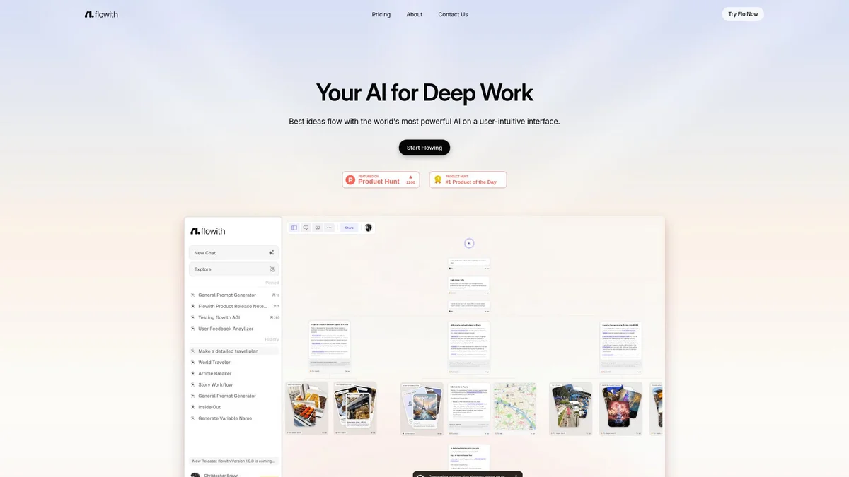 Flowith integrates AI-driven tools for image, video, website, and slide creation, enabling users to visualize, plan, and execute their ideas seamlessly.