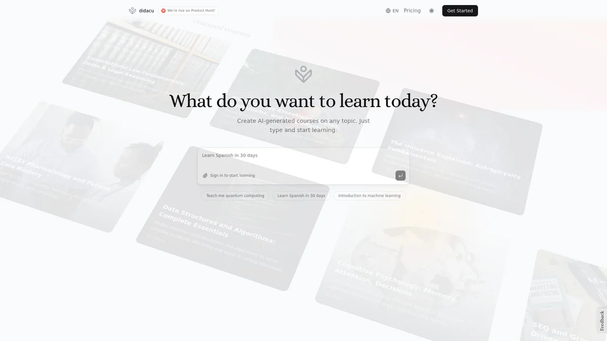 didacu.com transforms any learning topic into personalized, interactive courses with slides, quizzes, and progress tracking, tailored to individual learning needs.