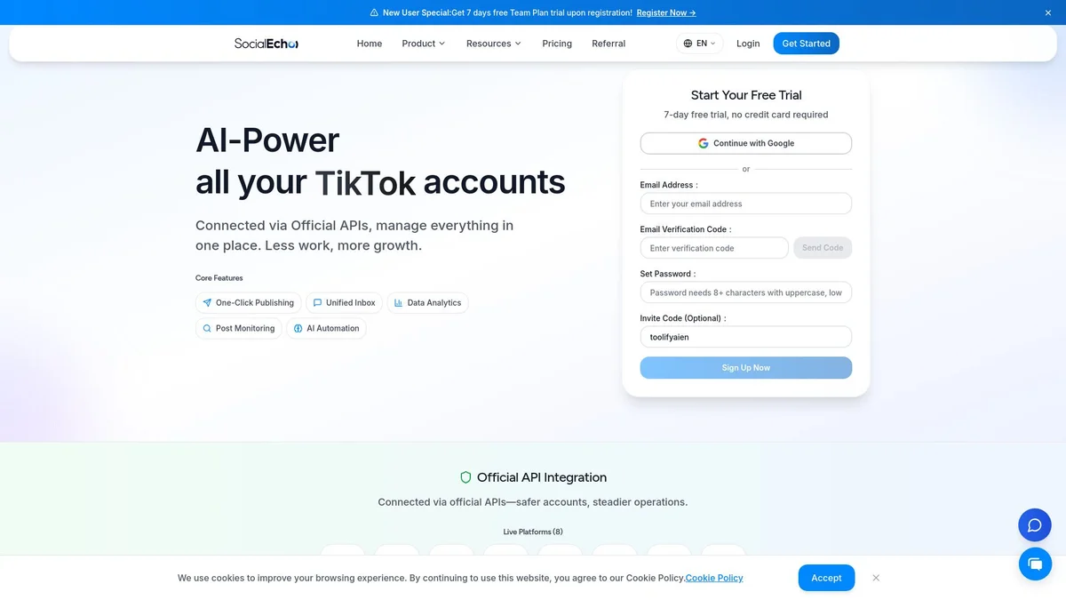 SocialEcho streamlines social media management with AI-driven tools for content publishing, messaging, and data analysis, enhancing efficiency and engagement across multiple platforms.