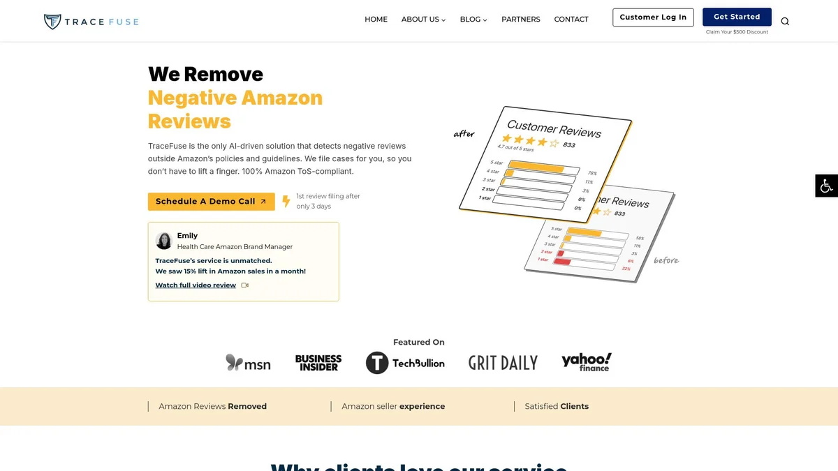 TraceFuse is an AI-driven service that identifies and removes negative Amazon reviews, boosting your brand's reputation and sales effortlessly with compliant strategies.
