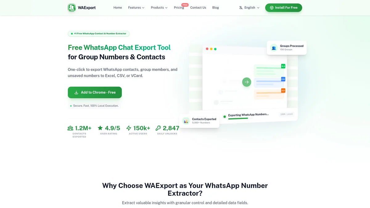 WA Export allows users to export WhatsApp contacts, group members, and chat histories effortlessly to various formats including Excel and CSV, ensuring data privacy and security.
