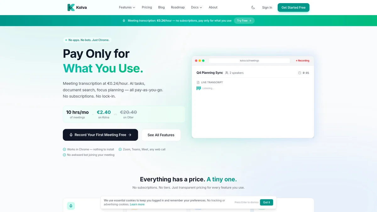 Kolva streamlines meeting management with AI-powered transcription, task organization, and document storage, all with a pay-as-you-go pricing model.