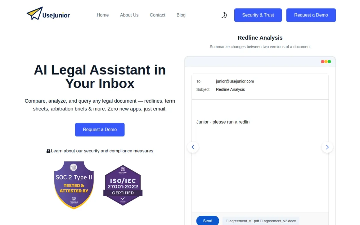 UseJunior streamlines legal workflows with AI-driven document review, contract comparison, and translation, tailored for law firms and businesses in document-heavy industries.