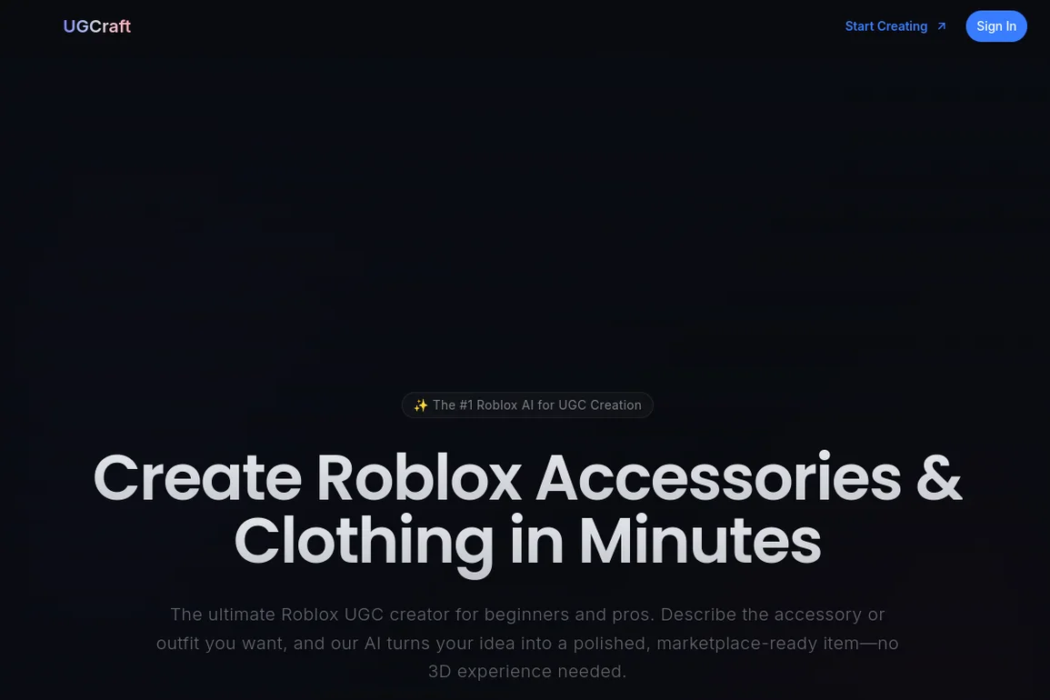 UGCraft is the ultimate AI tool for designing Roblox accessories and clothing, enabling creators to turn ideas into marketplace-ready items without 3D experience.