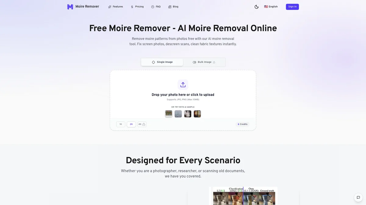 AI Moire Remover eliminates distracting moire patterns from images, enhancing clarity and quality for photographers and document scanners with just a few clicks.