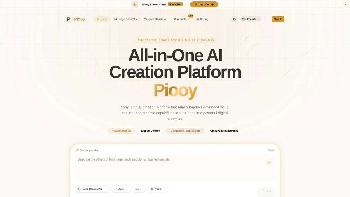 Piooy is an all-in-one AI creation platform that enables professional visual, motion, and creative work, transforming ideas into powerful digital expressions effortlessly.