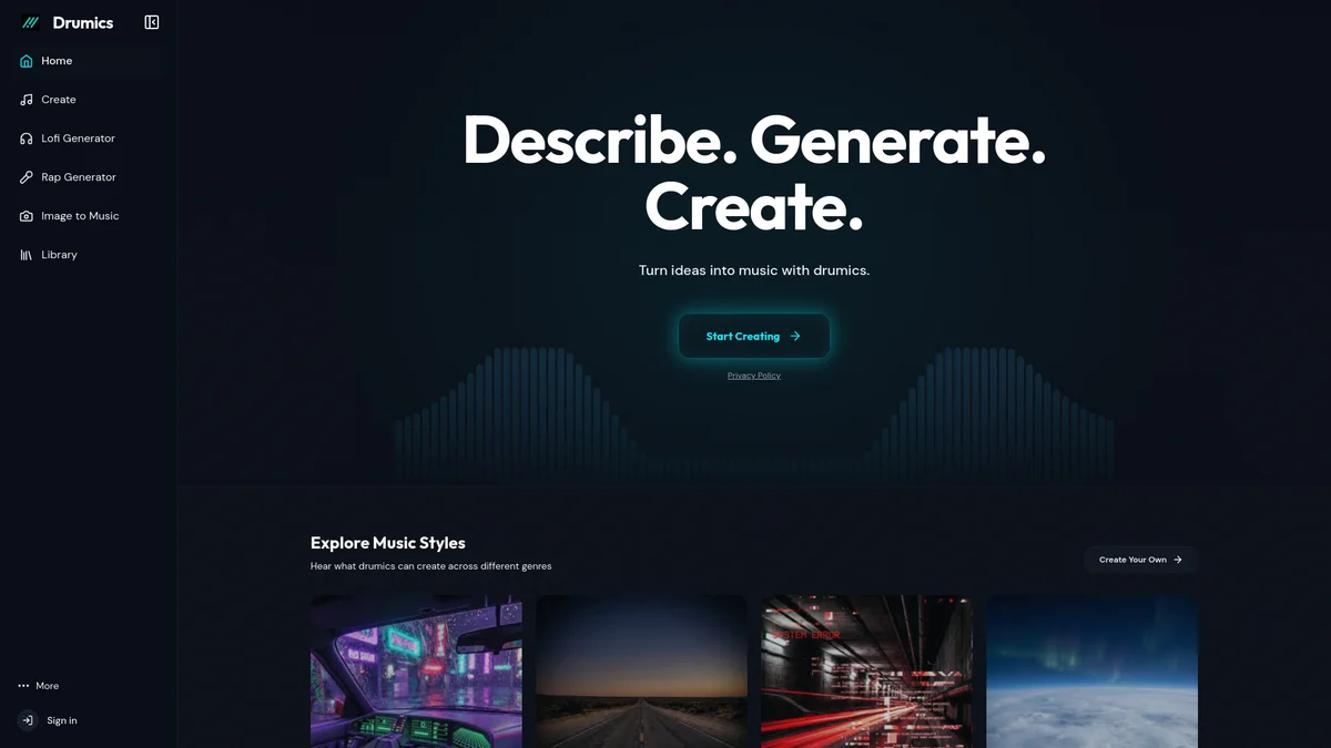 Drumics empowers users to generate unique music tracks in seconds, blending various genres and styles with human-like rhythms and professional sound quality.