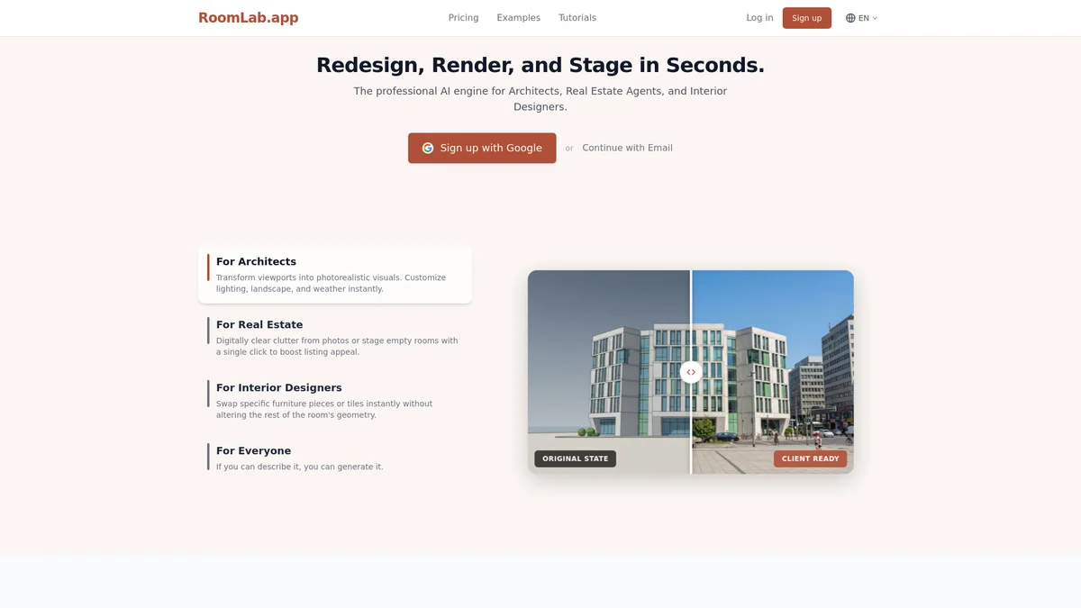 Transform spaces effortlessly with RoomLab's AI-driven design and virtual staging tools, tailored for architects, designers, and real estate professionals.