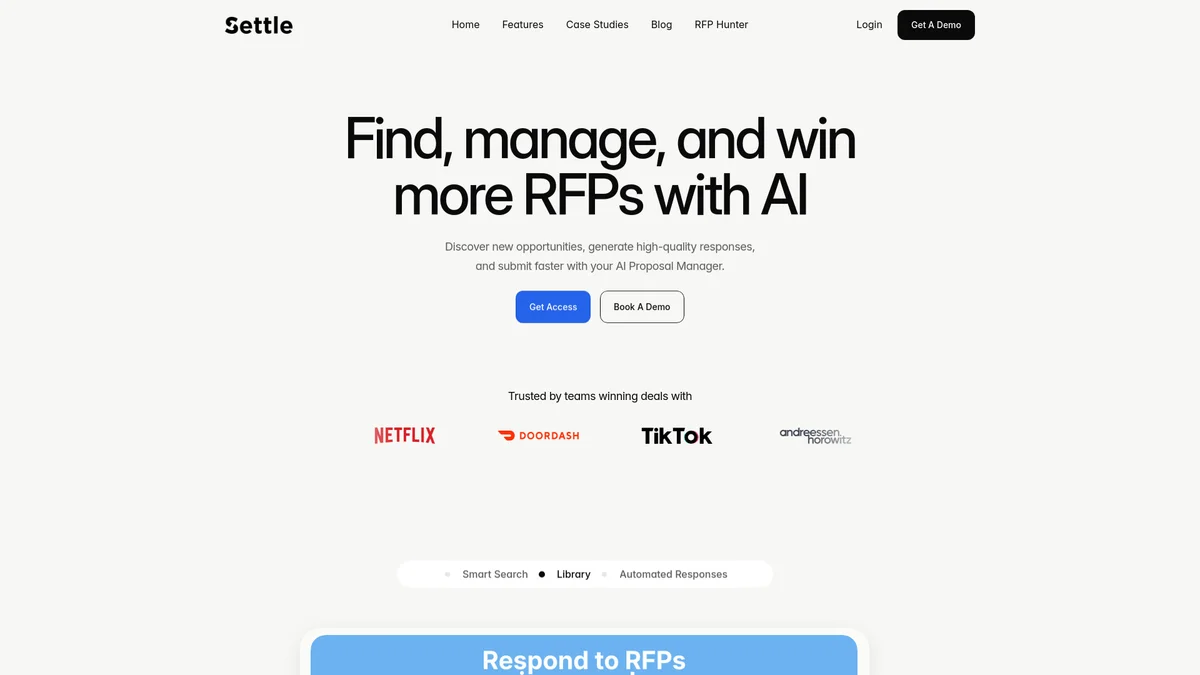 Streamline your RFP process with Settle's AI-driven tools for discovering opportunities, managing responses, and enhancing proposal quality.