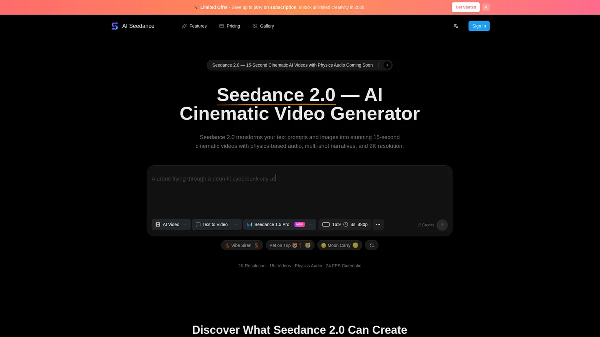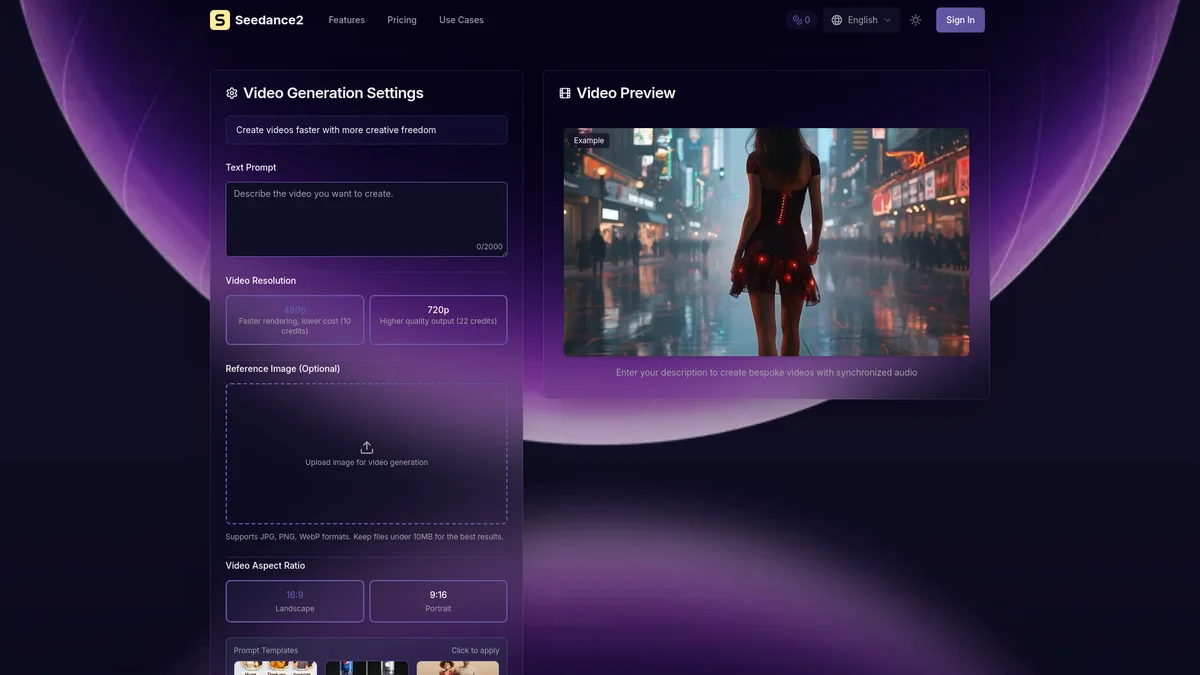 Seedance 2.0 AI Video Generator creates stunning 15-second cinematic videos from text prompts and images, featuring physics-based audio and multi-shot narratives in high resolution.