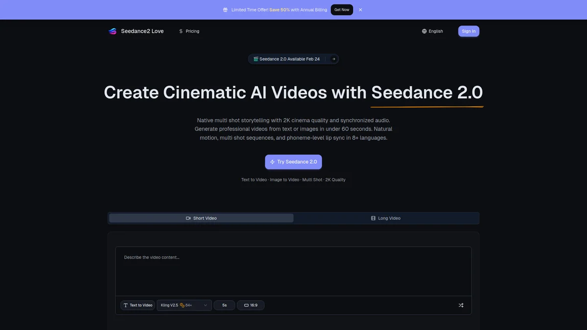 Seedance2.love enables users to generate 2K cinematic videos from text or images in under 60 seconds, featuring advanced storytelling and natural motion synthesis.