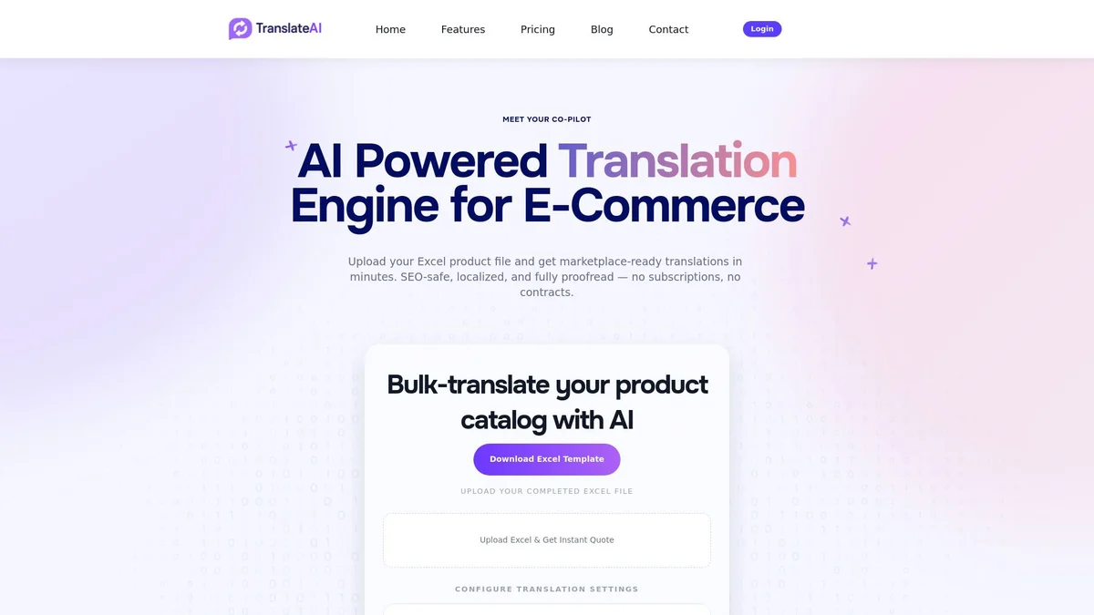 TranslateAI provides fast, AI-powered translations for e-commerce product catalogs, ensuring localized, SEO-safe, and proofread content without subscriptions or contracts.