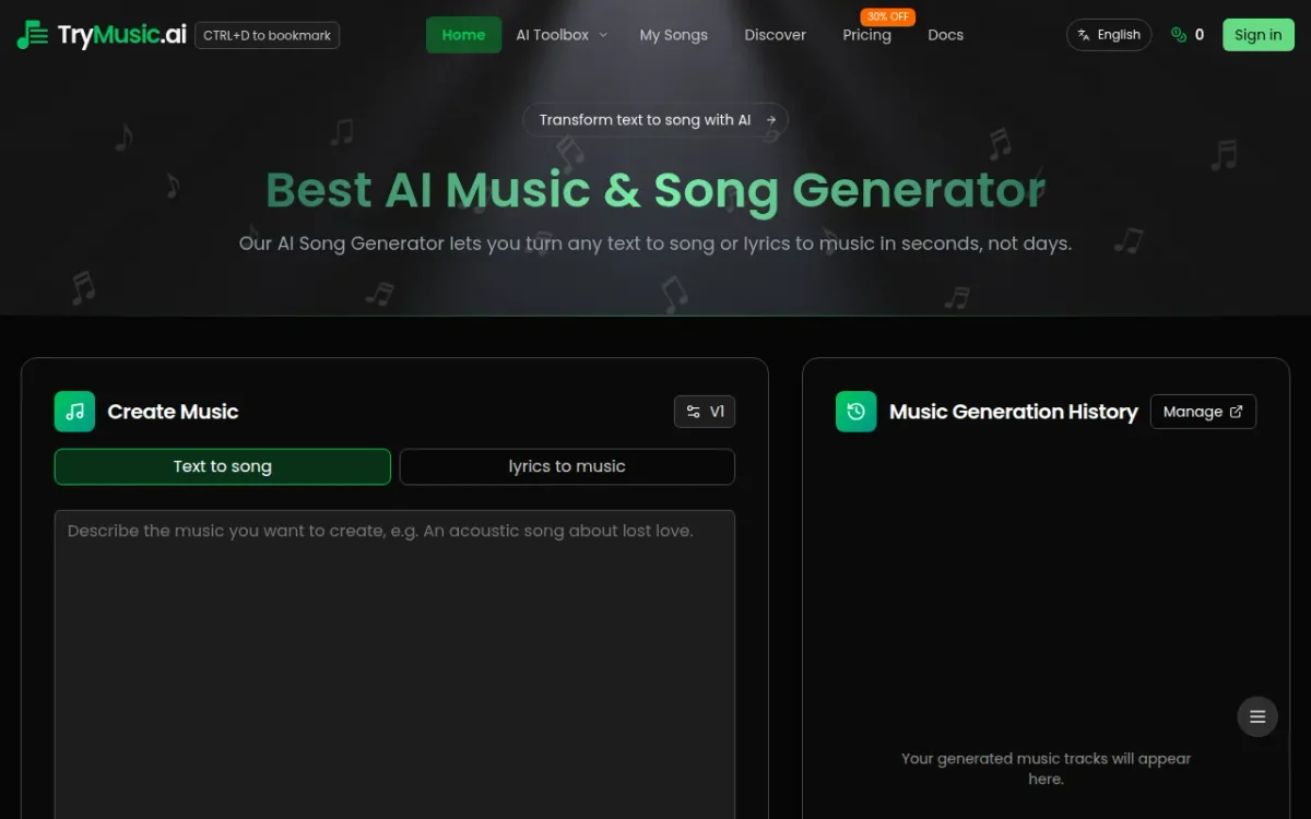 Create unique, royalty-free songs from any text or lyrics in seconds with Trymusic AI, designed for creators of all levels seeking studio-quality results.