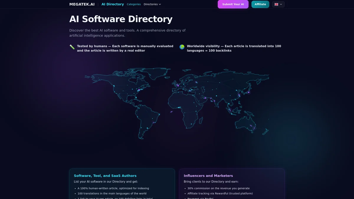 MEGATEK.AI is a comprehensive database connecting people, organizations, and resources in the AI ecosystem, available in 100 languages for global accessibility.