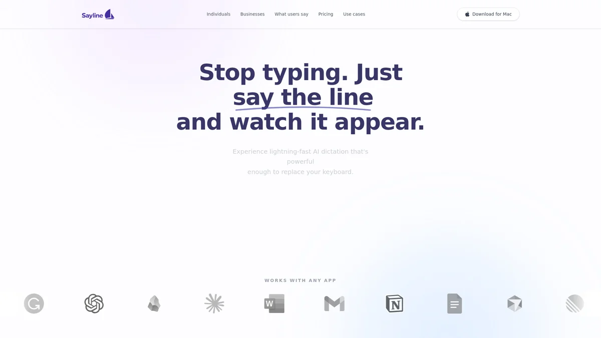 Sayline revolutionizes typing by allowing users to dictate their thoughts, achieving text output four times faster than traditional typing methods, all while ensuring privacy and security.
