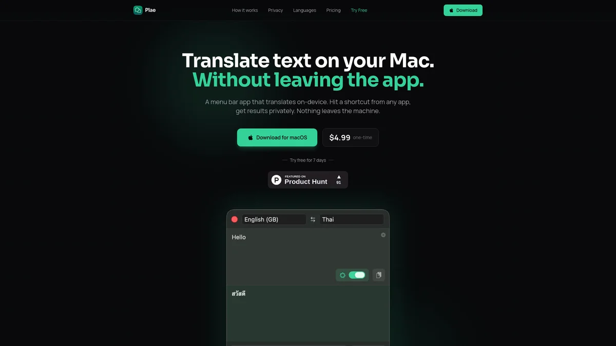 Plae offers seamless, private, on-device translation directly from your Mac, allowing users to communicate effortlessly without internet dependency or data tracking.