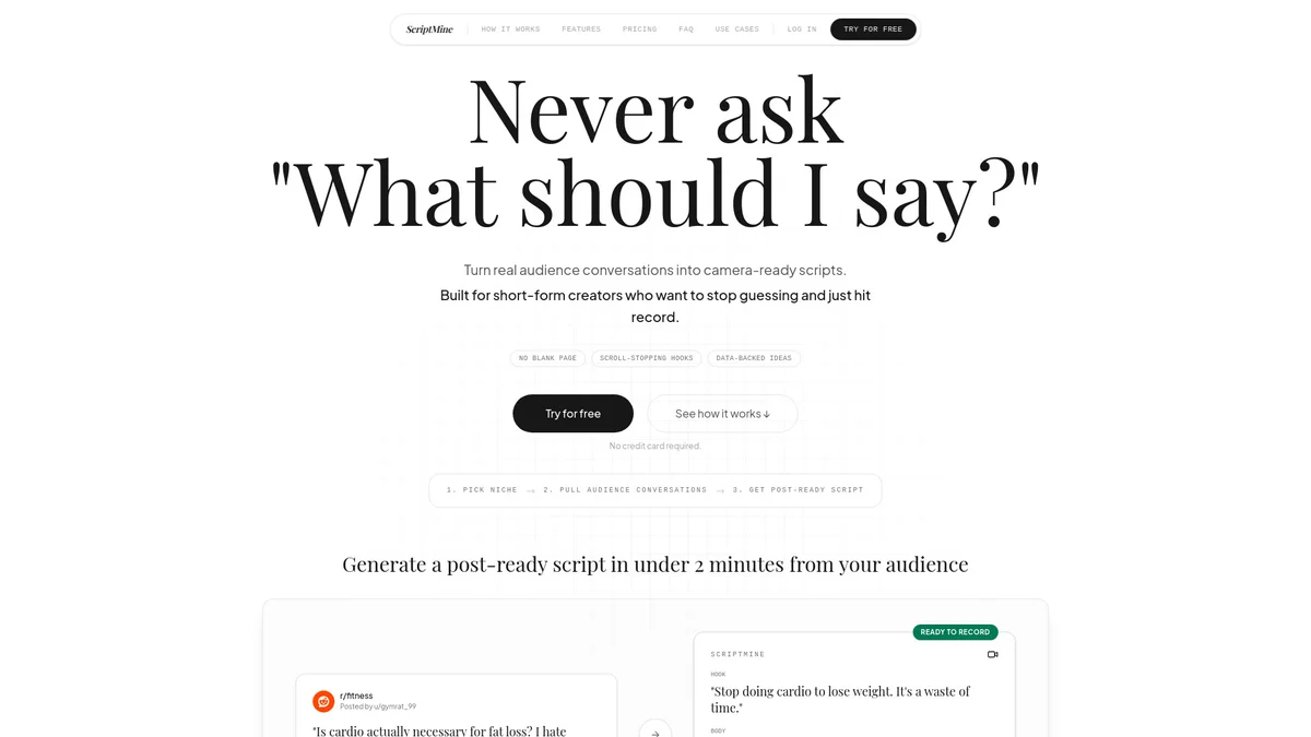Create engaging, camera-ready scripts from real audience questions on Reddit, tailored for content creators to enhance their recording efficiency.