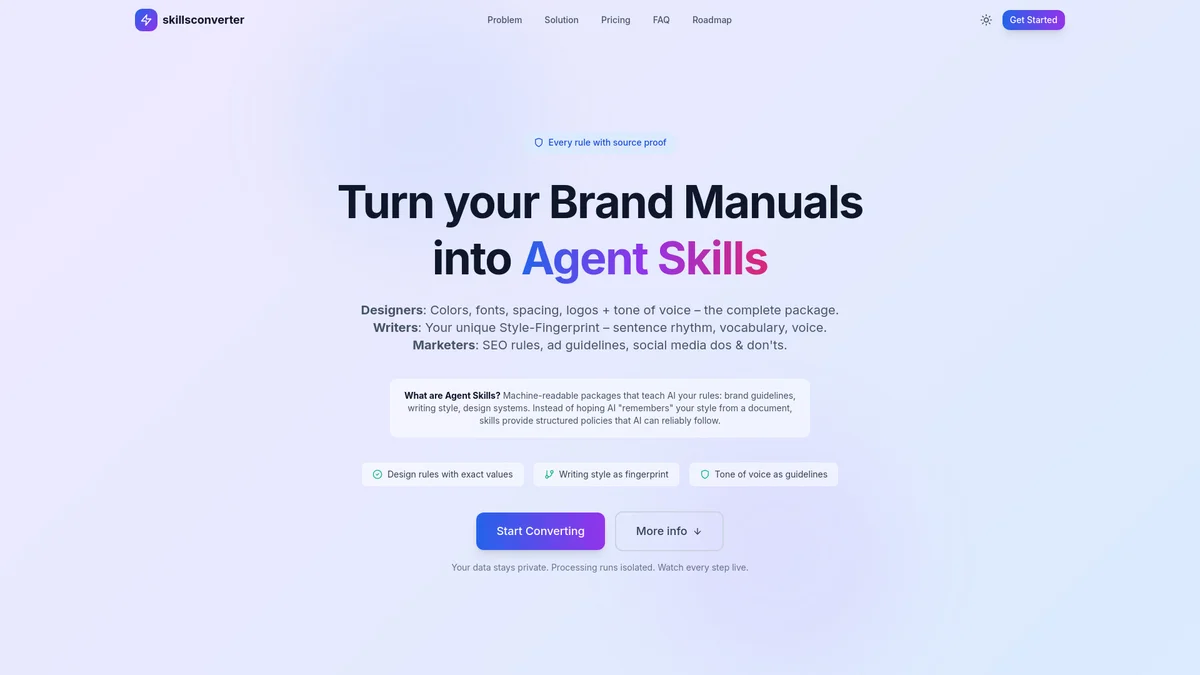 SkillsConverter creates machine-readable skill packs from your brand manuals, ensuring AI consistently follows your unique guidelines for design, writing, and marketing.