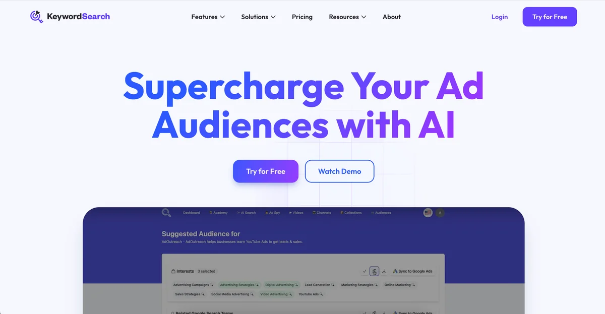 KeywordSearch.com helps businesses optimize their Google and YouTube ad audiences through advanced AI-driven keyword research and audience targeting tools.