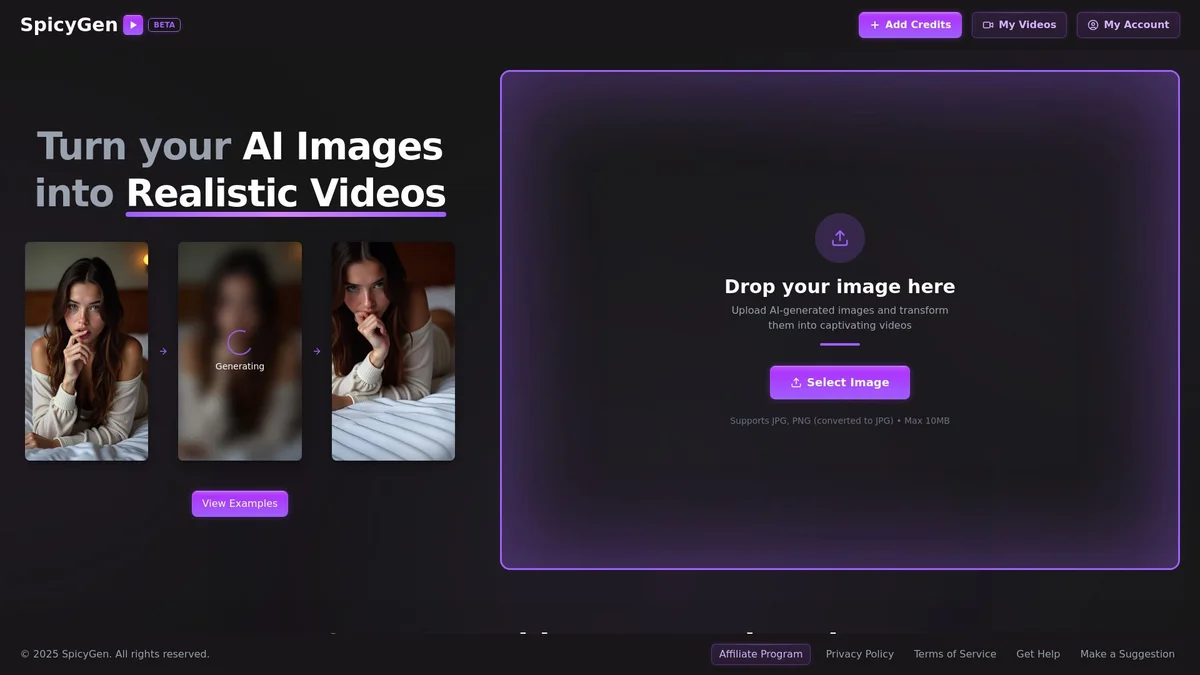 SpicyGen transforms static images into dynamic, high-quality adult videos using advanced AI technology, providing a unique and immersive creative experience.