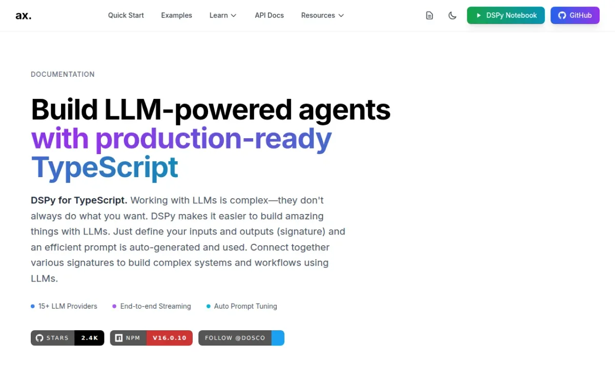 Ax simplifies the development of LLM-powered applications in TypeScript, offering automated prompt generation and robust integration with multiple AI providers.