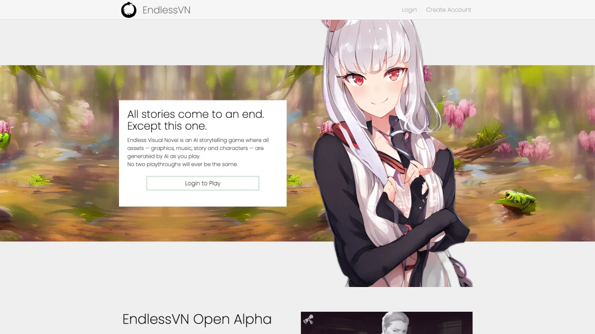 Experience unique storytelling with AI-generated characters, graphics, and music in an endless visual novel format. No two playthroughs are ever the same.