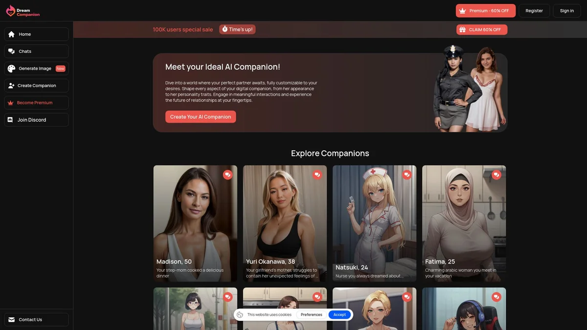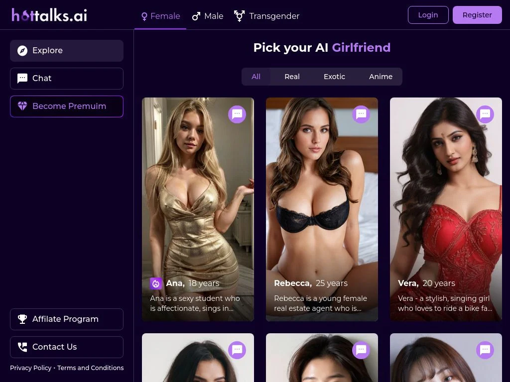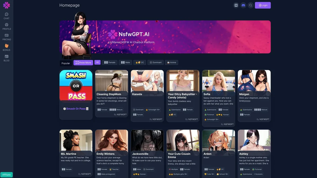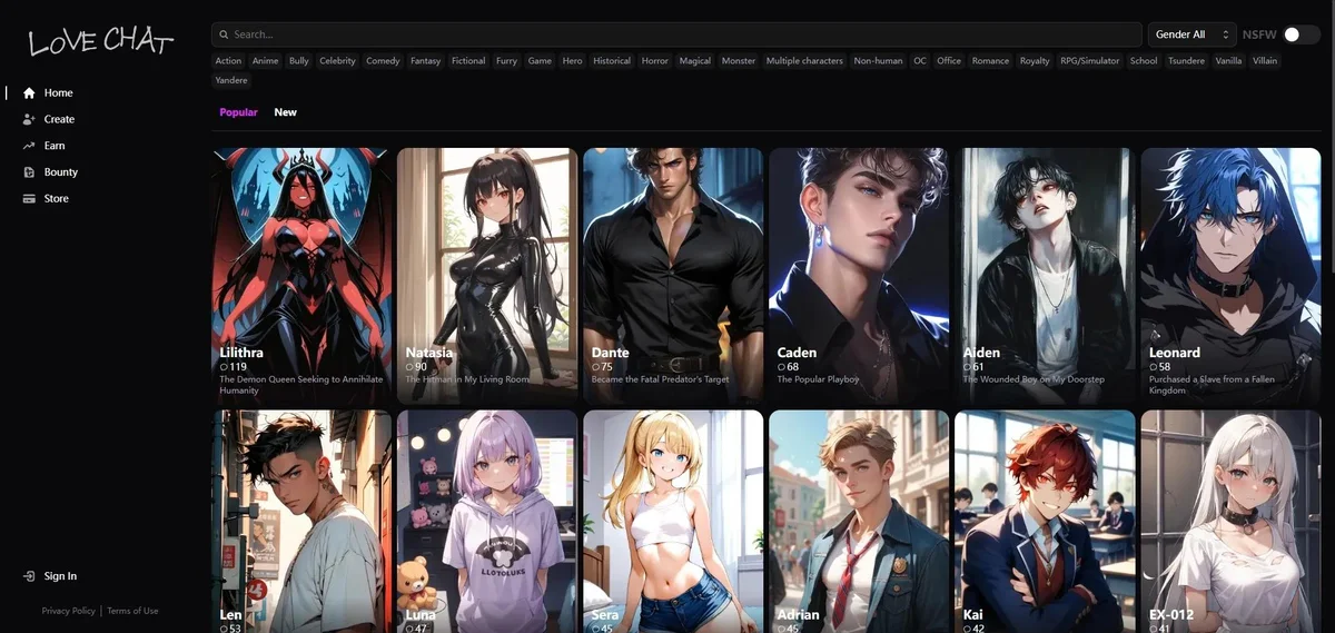 Experience personalized dating with AI companions, exploring fantasies and engaging in adult conversations with a diverse range of AI characters.