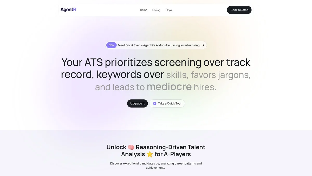 AgentR is an AI-powered hiring assistant that streamlines the recruitment process by identifying genuine talent and reducing inefficiencies in hiring.