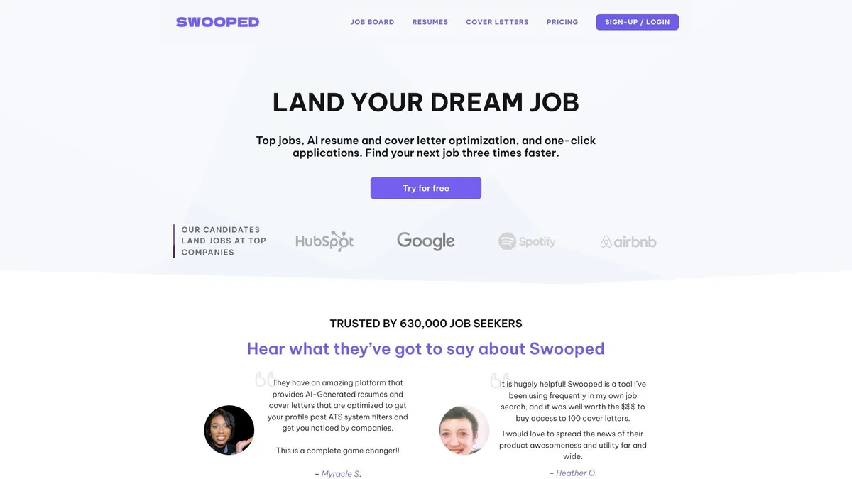 Swooped is a comprehensive AI resume builder and job search platform, designed to help job seekers create resumes and cover letters that get noticed by employers.