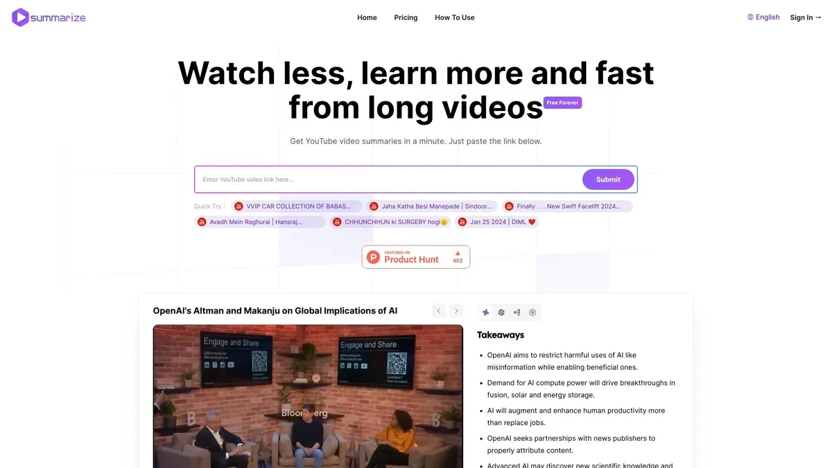 Summarize YouTube videos in under a minute with AI-driven insights, transforming lengthy content into concise digests for smarter learning and efficient information retention.