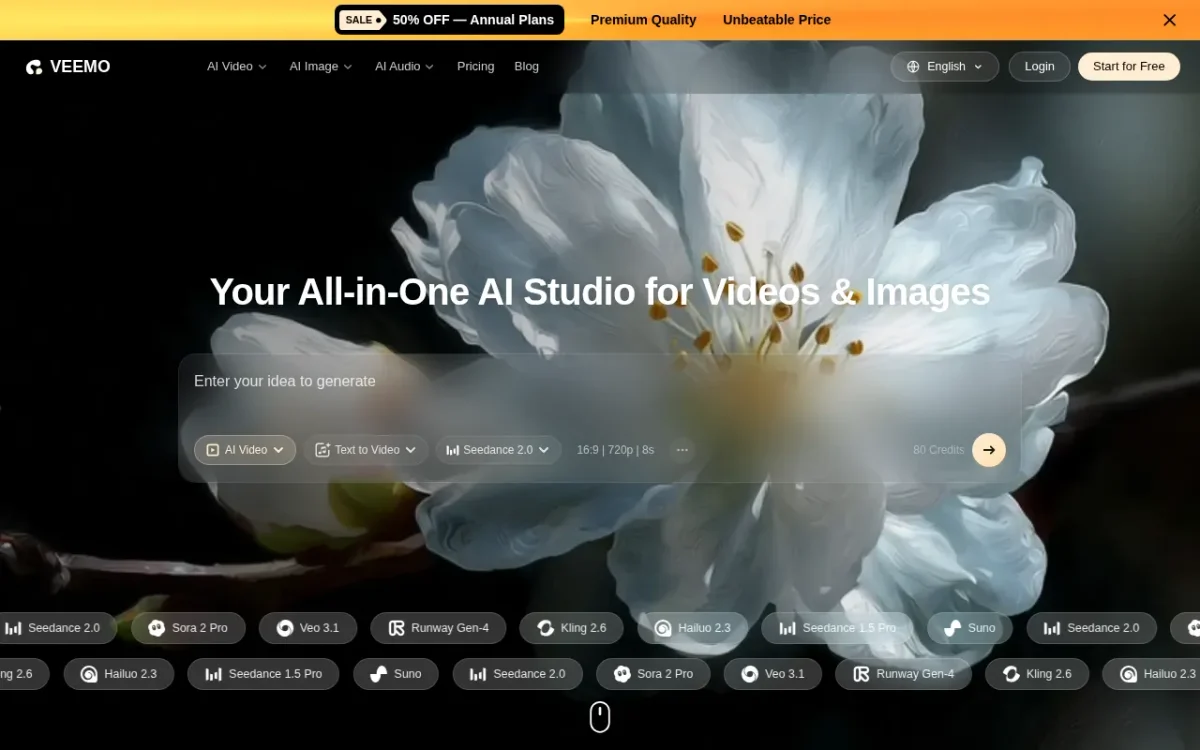 Veemo is an all-in-one AI video and image generator that transforms text prompts into high-quality visual content quickly and easily.