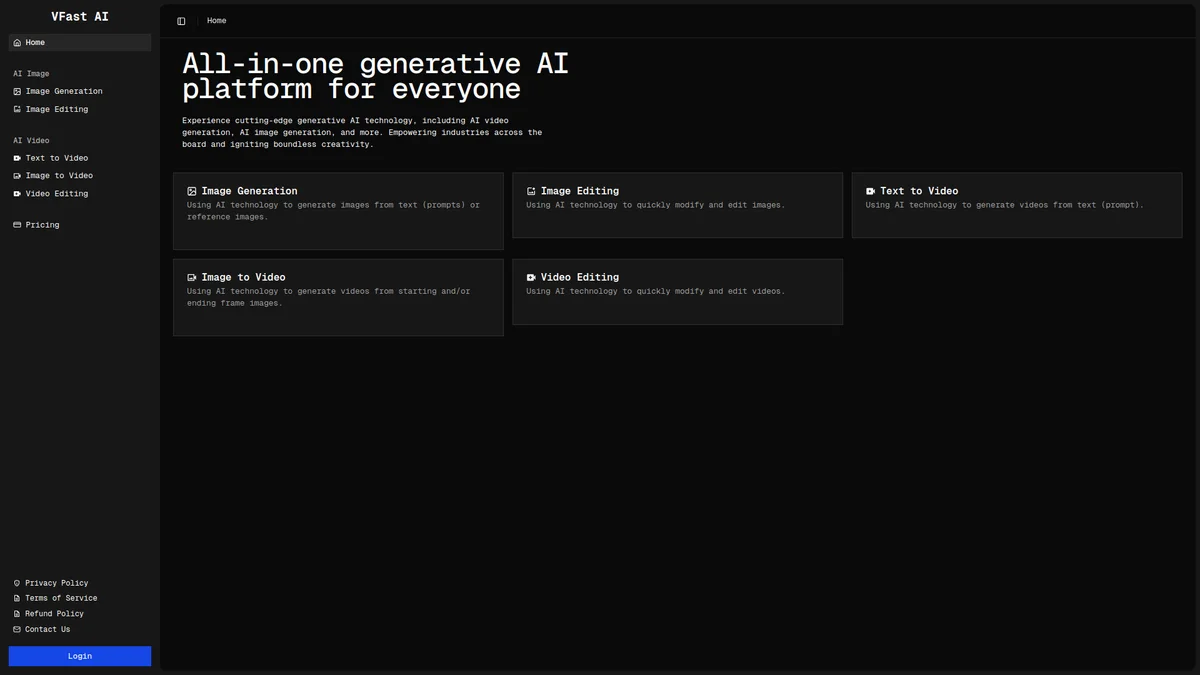VFast AI offers cutting-edge generative AI technology, enabling users to create and edit images and videos with just a text prompt, fostering creativity across various industries.