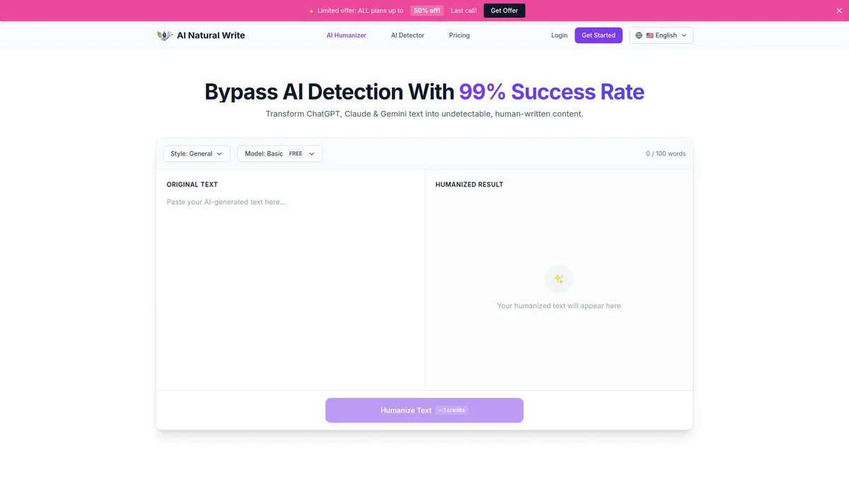 AI Natural Write humanizes AI-generated text, ensuring it passes detection and reads authentically like human-written content, ideal for various writing needs.